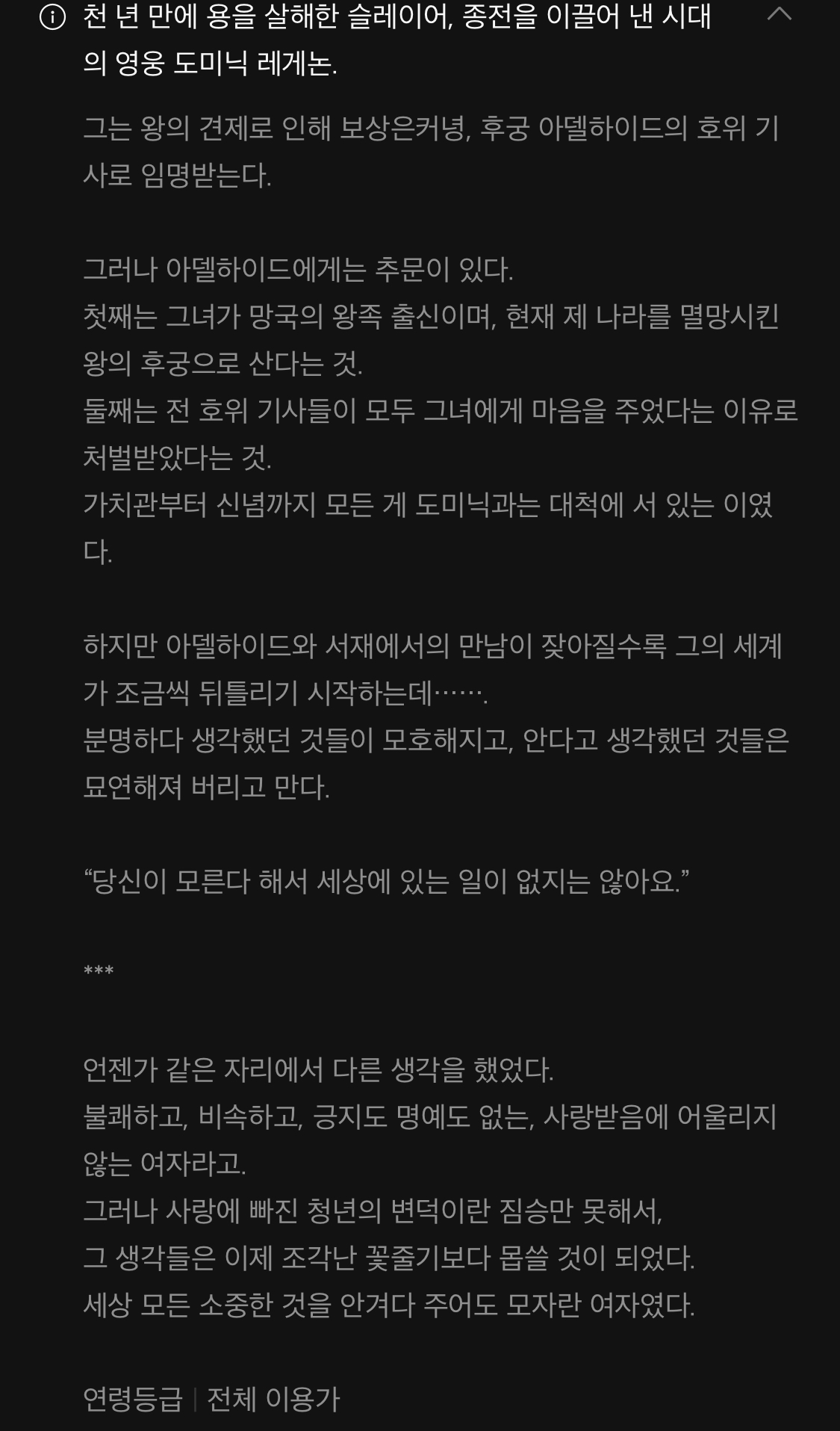 판타지 속 상상력이 감히 된 사건들은 흥미를 불러일으키기도 하지만 우리 현재 사회에서도 한 번쯤 생각해 보면 또 다른 재미가 있는 질문이 잔뜩 던져지는 이야기다. 다른 메시지들도 꽤 많으니 로맨스 판타지가 소설 읽고 싶으신 분들이라면, “일어나지 않은 것들에 관하여” 기억하기.